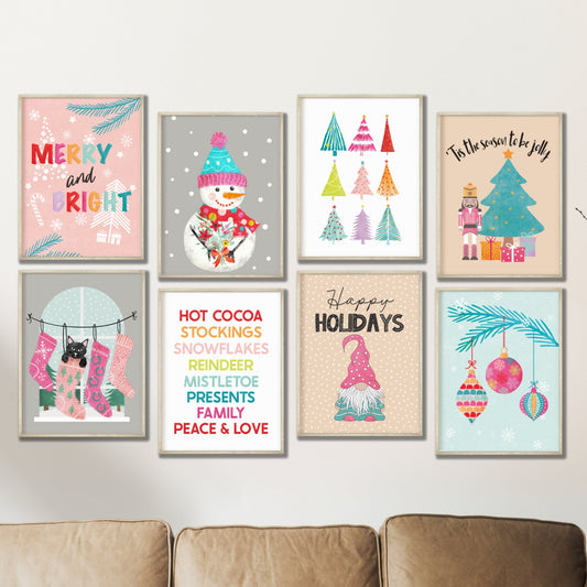 Printable Pink Christmas Decor Prints Set of 8, Colorful Christmas Wall Art, Christmas Decor
