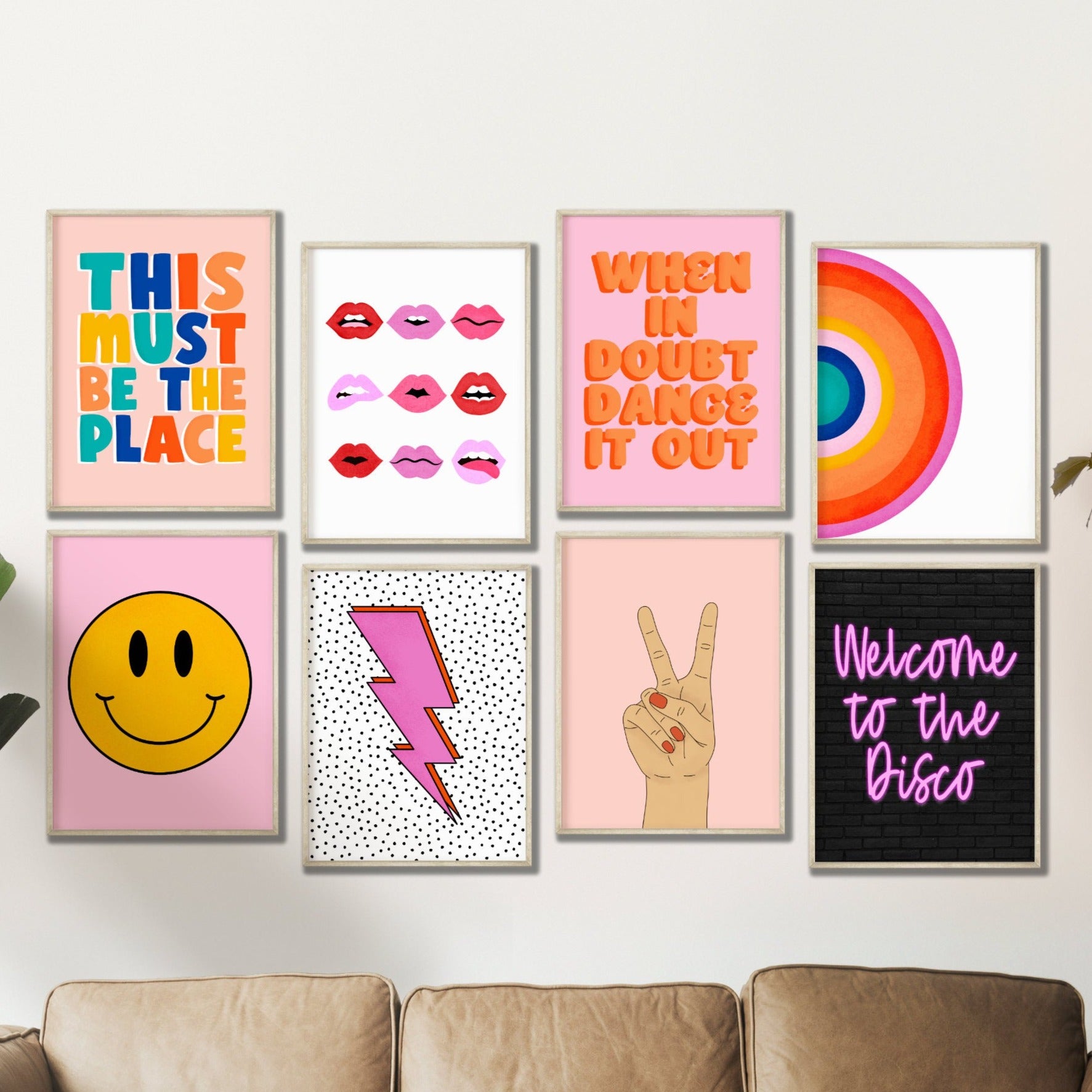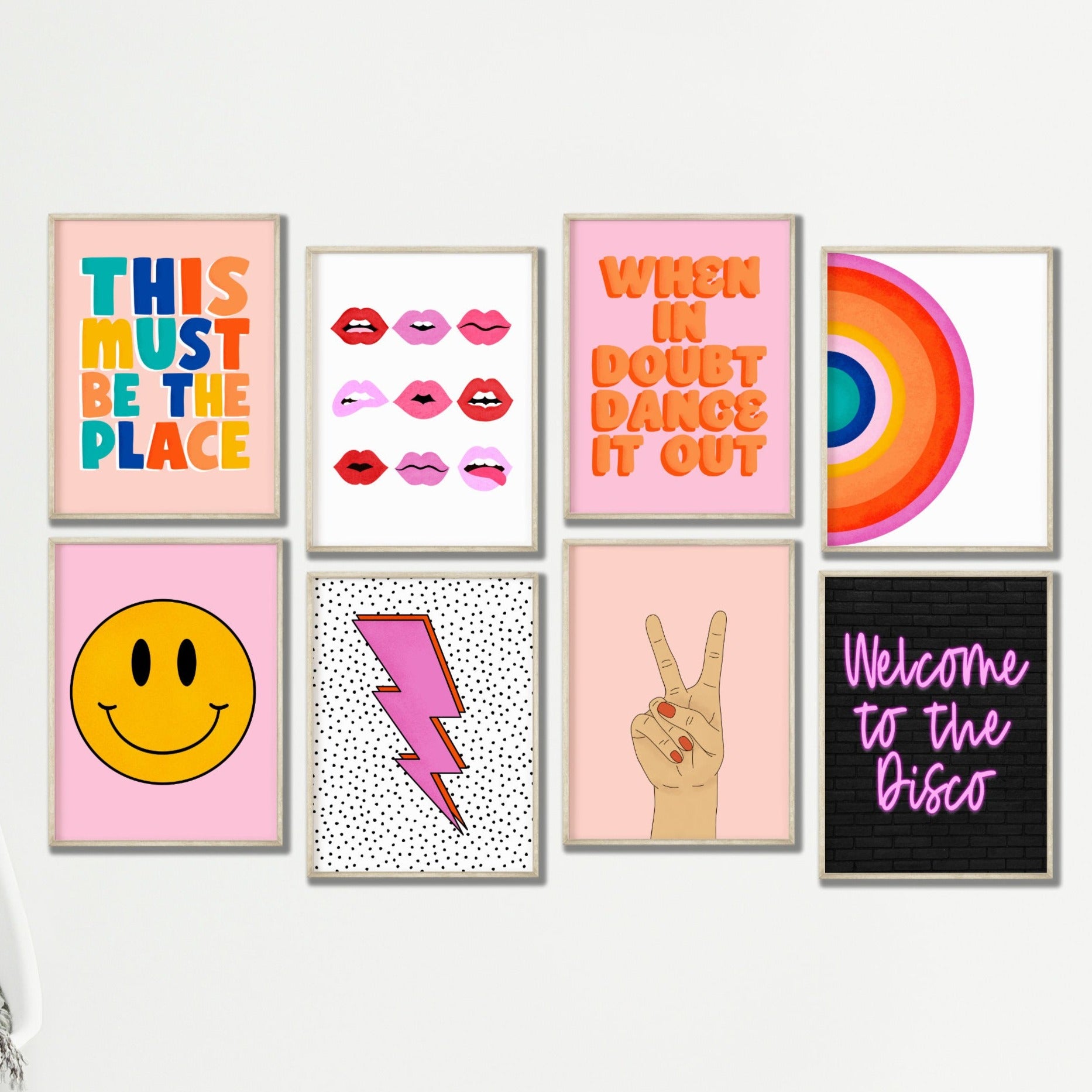 Decorate your walls with all things fun and girly with this pink gallery wall set from JJ Design House. Our pink aesthetic room decor is a mix of illustrations and short inspirational quotes and boho-inspired images all designed to add a feminine touch to any bedroom, dorm room, or apartment. Fun quotes include "This Must be the Place", "When in Doubt Dance it Out", and "Welcome to the Disco".